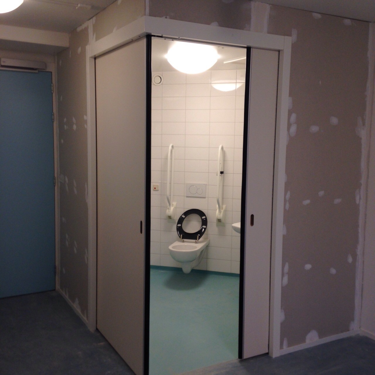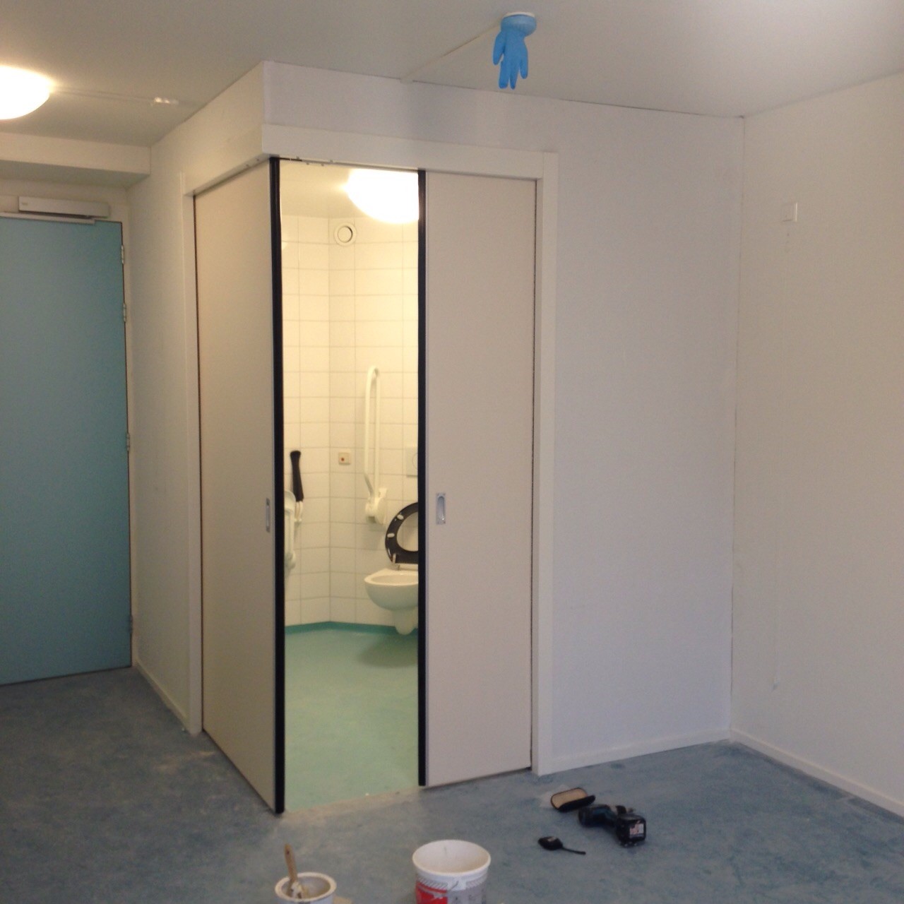 Er is hier gekozen voor een zeer veel ruimtebesparende oplossing, vanwege de grootte van de kamers en de ruime doorgang richting badkamer, die gewenst werd. Voor de goede aansluiting van de dubbele deuren werden rubberen stootranden geplaatst.