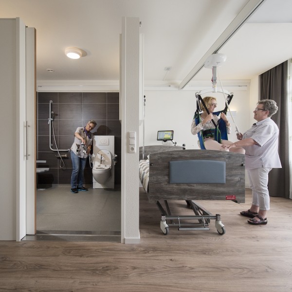 Dit systeem maakt het mogelijk de nieuwste trend op het gebied van tilliftsystemen in combinatie met schuifdeuren toe te passen. Betere en betaalbare zorg met minder handelingen en meer comfort voor de bewoner. De nieuwe standaard voor verpleegafdelingen.